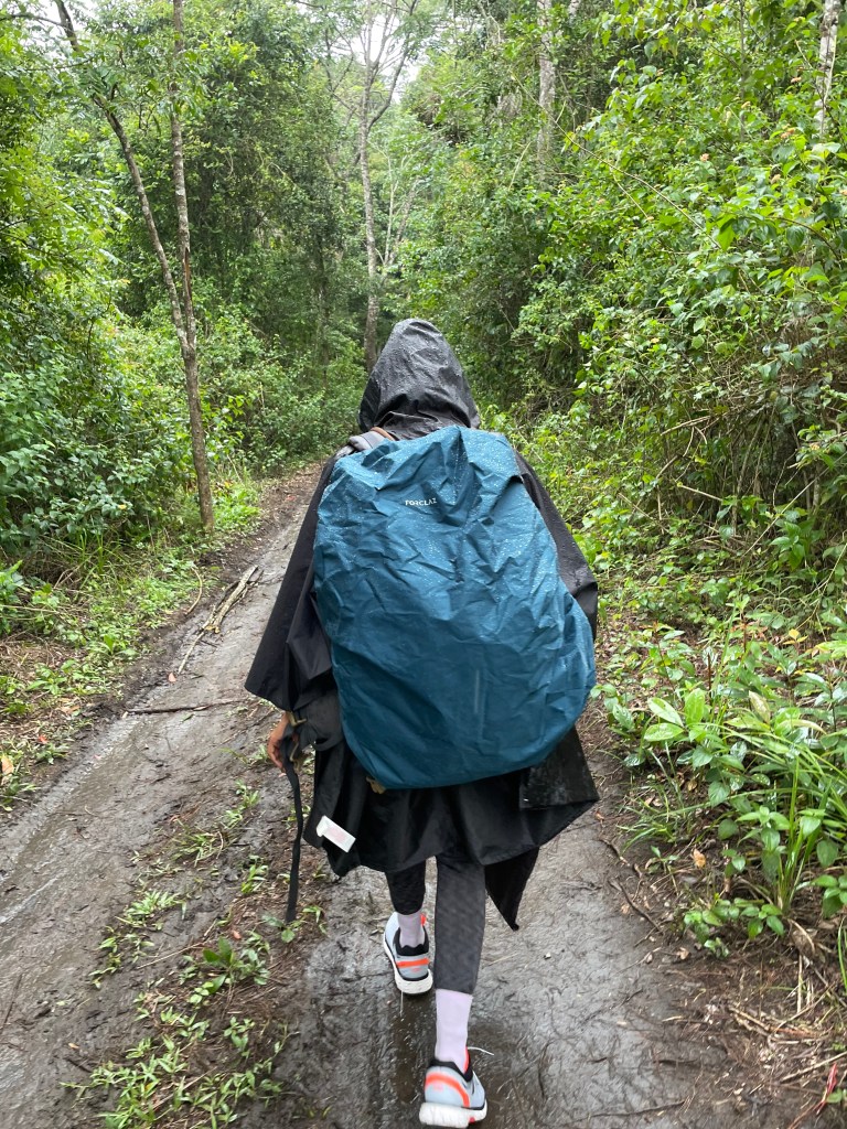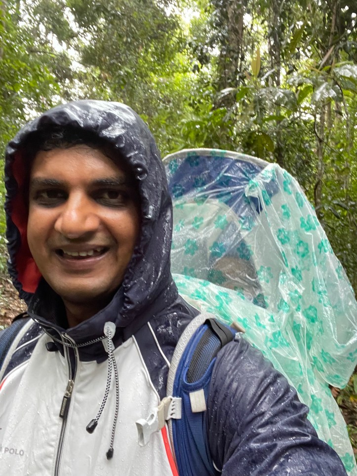 In the pines, the drizzle turned heavy and we covered up little Arjun in his hiking carrier, with a transparent rain cover. Dhanya put on her poncho and I was wearing my newly acquired jacket from the night market, which turned out to have all the water repellant attributes of a sponge !