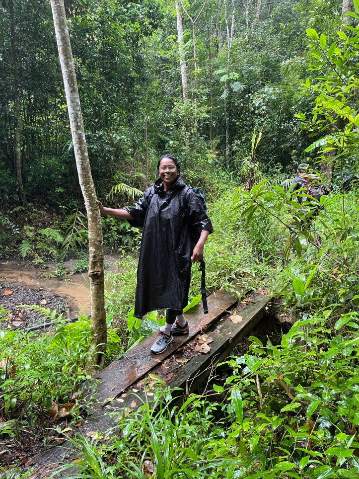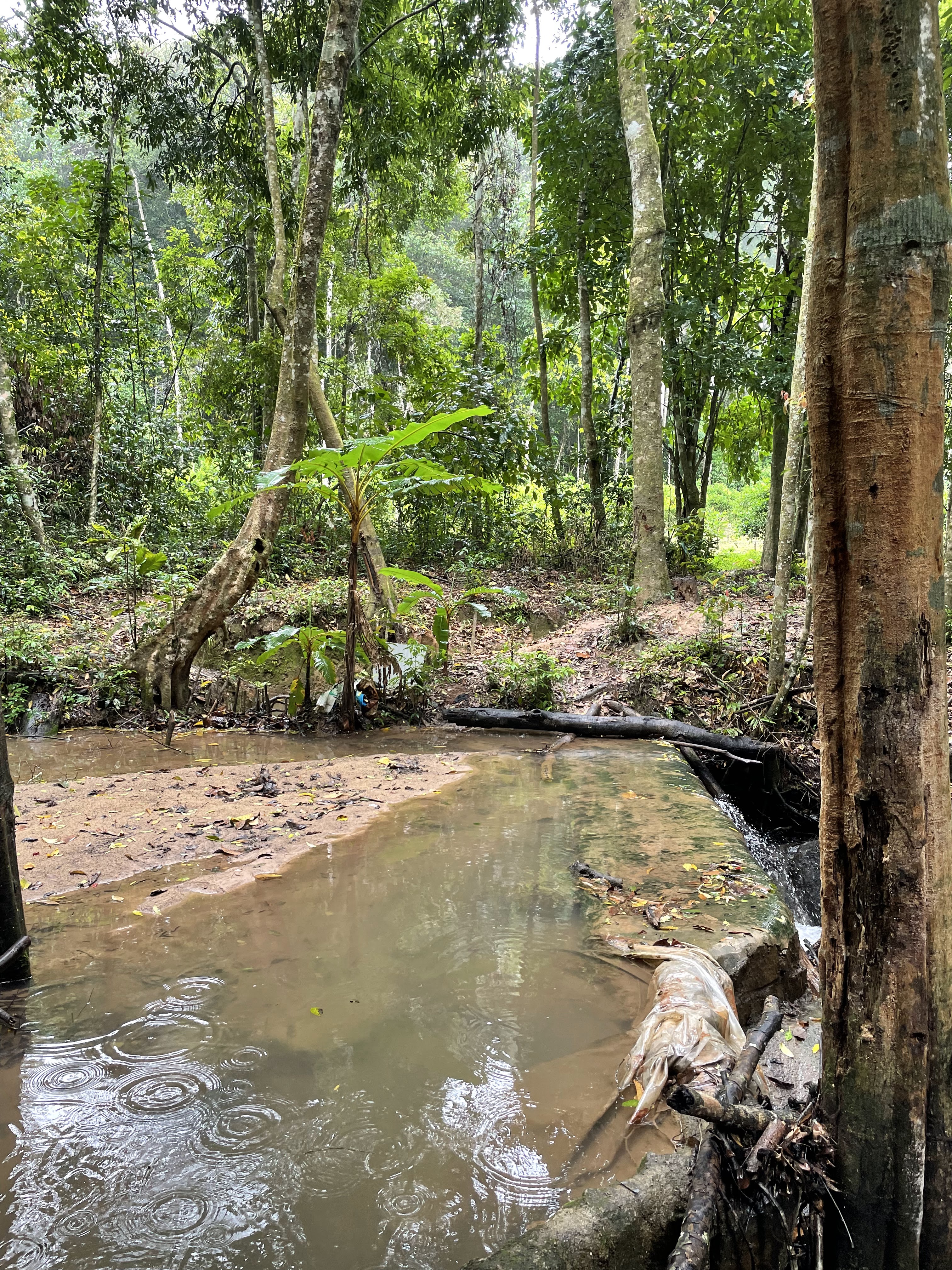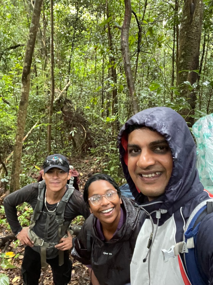 The path narrowed and the pine woods gave way to the jungle with thick lush creepers and wet dripping trees. The trail was now just gooey mud and Linh had to bushwhack through the undergrowth. Arjun was edgy with the rain and not being able to see much (with the rain cover, a thin plastic rain coat that we purchased the night before in the market) and we sang songs about broken pickup trucks(Caspar baby pants!) to ward off a complete meltdown. He is after all three years old. I would say he was an awesome sport for his age.