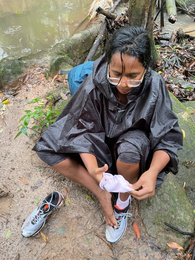 Rivulets cut through the path and we walked gingerly on mossy logs. At a particularly deep crossing, wading through the stream was our only option. We took off our shoes, and marched on . I (Satya) am paranoid about leeches and if there is a leech around, my ankles never fail to bait them. Must be my sweet blood. I was still scratching the leech bites from Coorg (if you are in India you must go here!) in April and frantically kept checking my feet, to see if anyone had hitched a bloody ride.