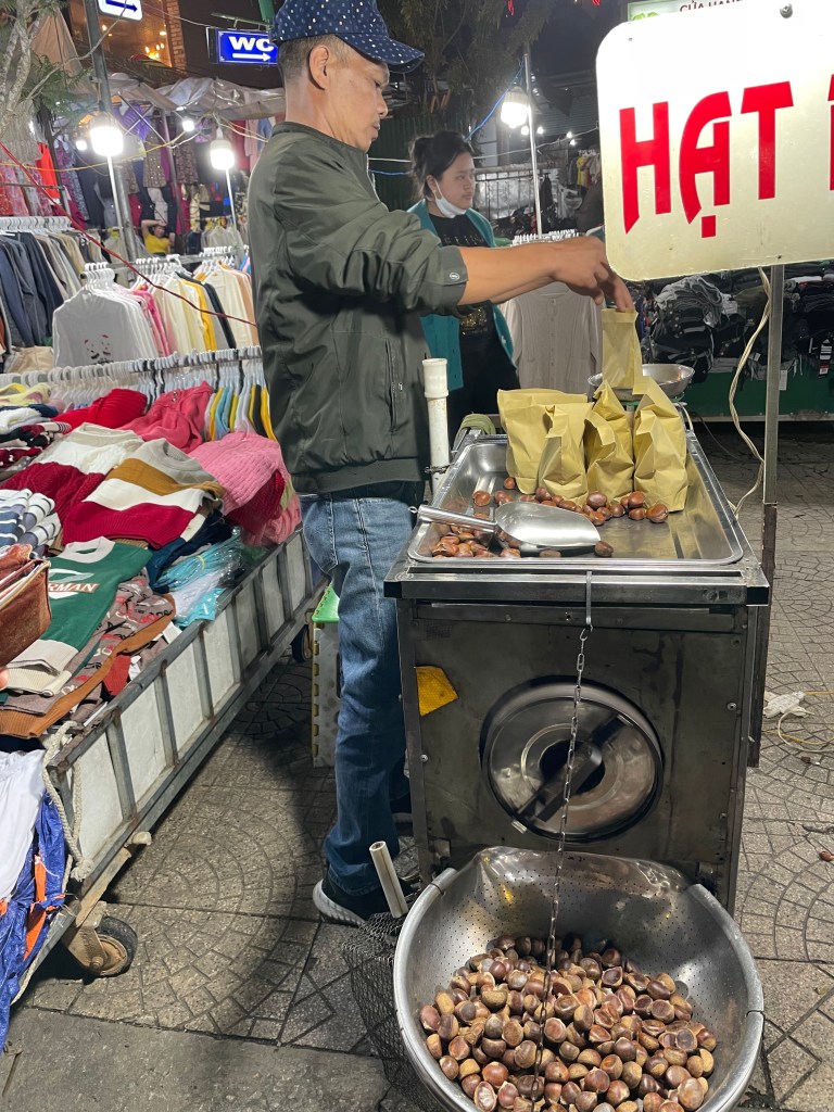 There is the pungent fragrance of freshly cut Durian (which I Dhanya, love) and the earthly nutty scent of roasted chestnuts. It is common to see visually impaired couples singing traditional Vietnamese songs on mikes attached to small, roll-along speakers; passersby drop in money as they go. You can buy fake Nike pullovers, knock-off Louis Vuitton bags or pickup rough woolen knitted sweaters knitted locally. They are very cheap, costing less than a few dollars at times and passably good enough.