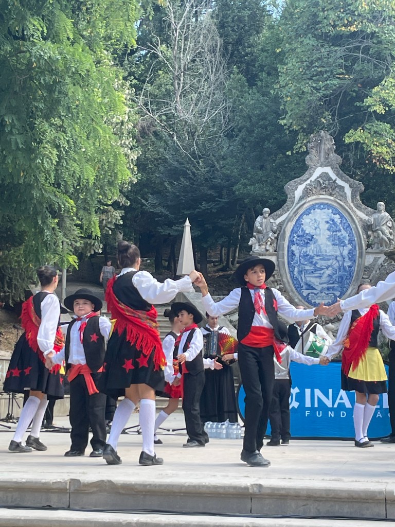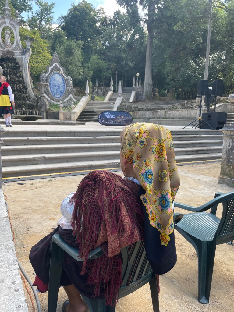 We then wander around the garden and Arjun makes stone powder with a piece of chalky stone. I learn that some of the crowd has come from Lousa, a town 30 kms from Coimbra. Dhanya arrives with a yummy lunch of grilled fish and bruschetta. We picnic on the benches and appreciate the afternoon sun.