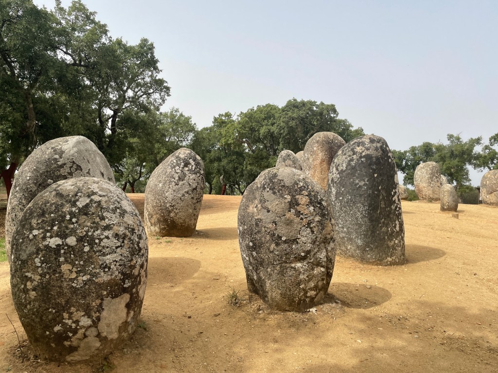 A short drive out of Evora, lies the megalithic complex of Almenders. A hundred weathered granite egg-shaped boulders lie in a rough ellipse on a gentle slope facing the East. Cork trees, with their peeled barks revealing a cinnamon core, provide the perfect backdrop. These menhirs are about 7500 years old and were built by the communities, who settled here over the course of several generations.