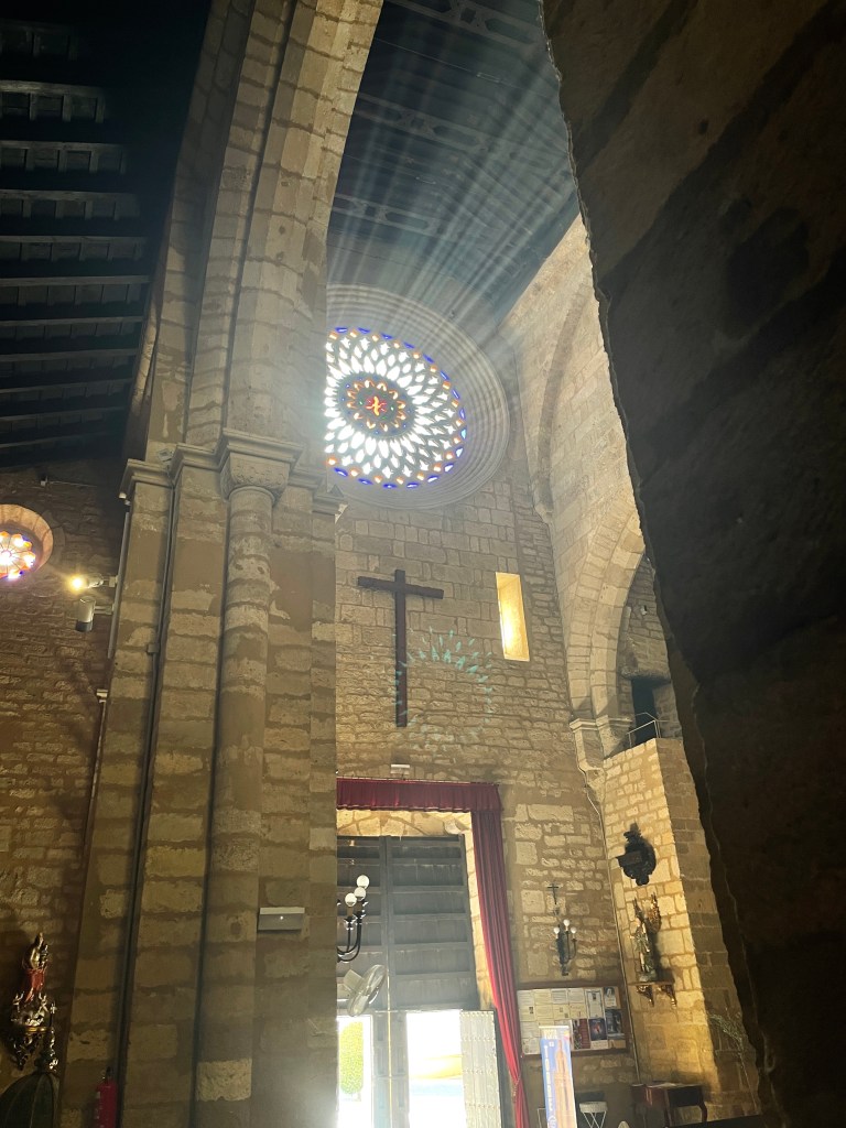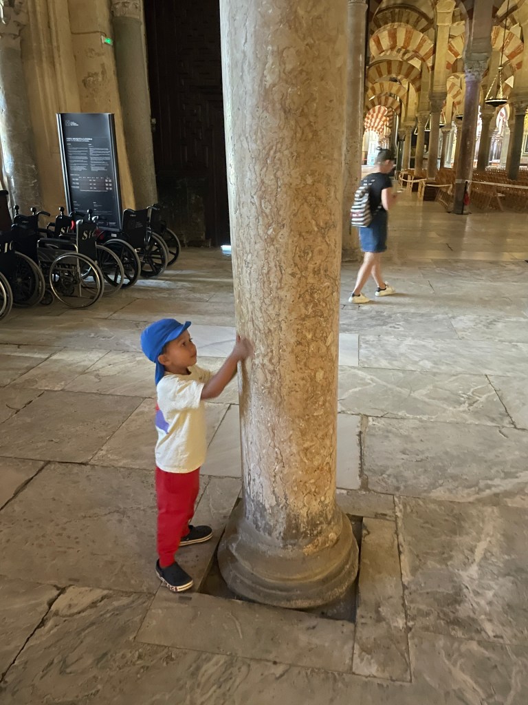 To one end there is a tiny museum and great pains are taken to illustrate how there was a Visigothic church before the Moors built their Mosque, which was followed by the Reconquista cathedral. So the official historical timeline is Visigoth Church followed by Mosque, followed by Roman Catholic Church. Later on I found out that the Visigothic Church theory is a little disputed. A beautiful rose window, throws multi hued light on the floor and Arjun is enthralled. Our blessings to whoever built that rose window.