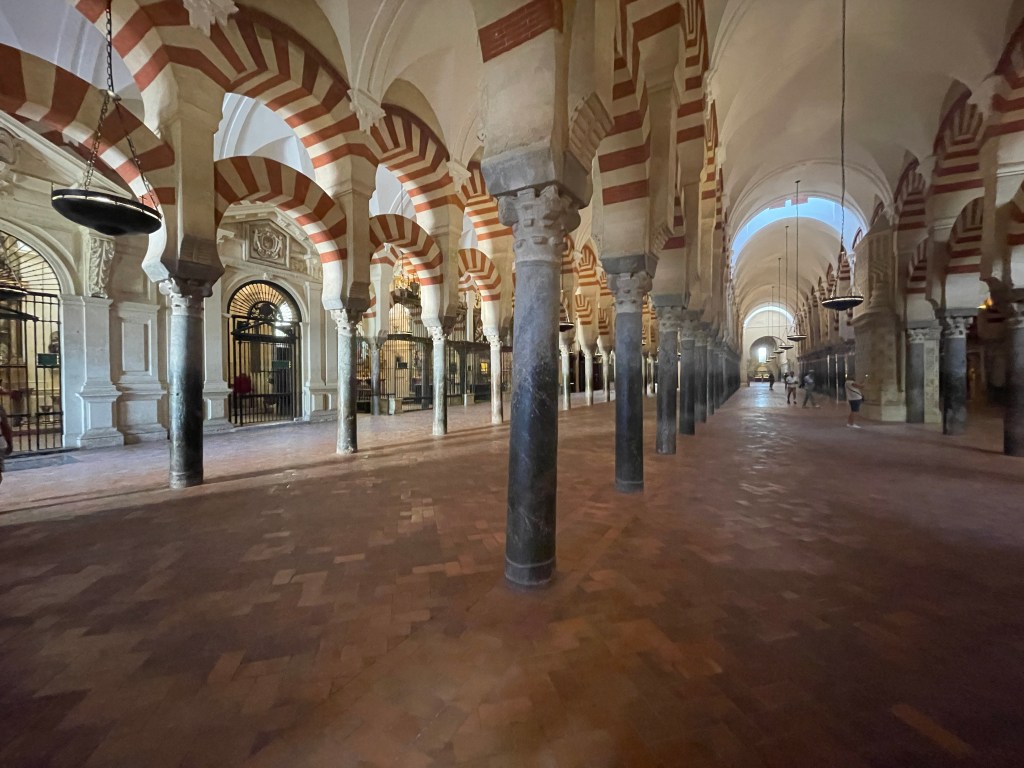 The main hall of the Mezquita has an abundance of pillars. Some marble, some reddish porphyry and some black granite. They support two tiered arches. The double arches are the subject of much interest. The artistically inclined argue that their resemblance to date palm trees was what inspired Abd al Rahman, the caliph who built it. The engineers content that the double arches were required because the pillars were not long enough. The double arches add a few feet of height. Some of the pillars are reused from ancient Roman structures and perhaps the builders were forced to innovate once they went down the path of recycling pillars.