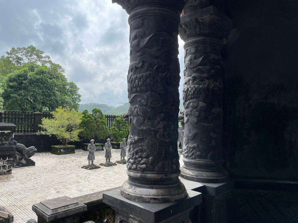 Even Khai Dinh’s tomb is all concrete and reflects his obsession with French modernity. It has aged badly in comparison with the Taoist, Buddhist-influenced architecture of the other emperor’s tombs. It lacks the perennially pleasing aesthetic of water, rock, and floating pagoda roofs opening up to the sky.