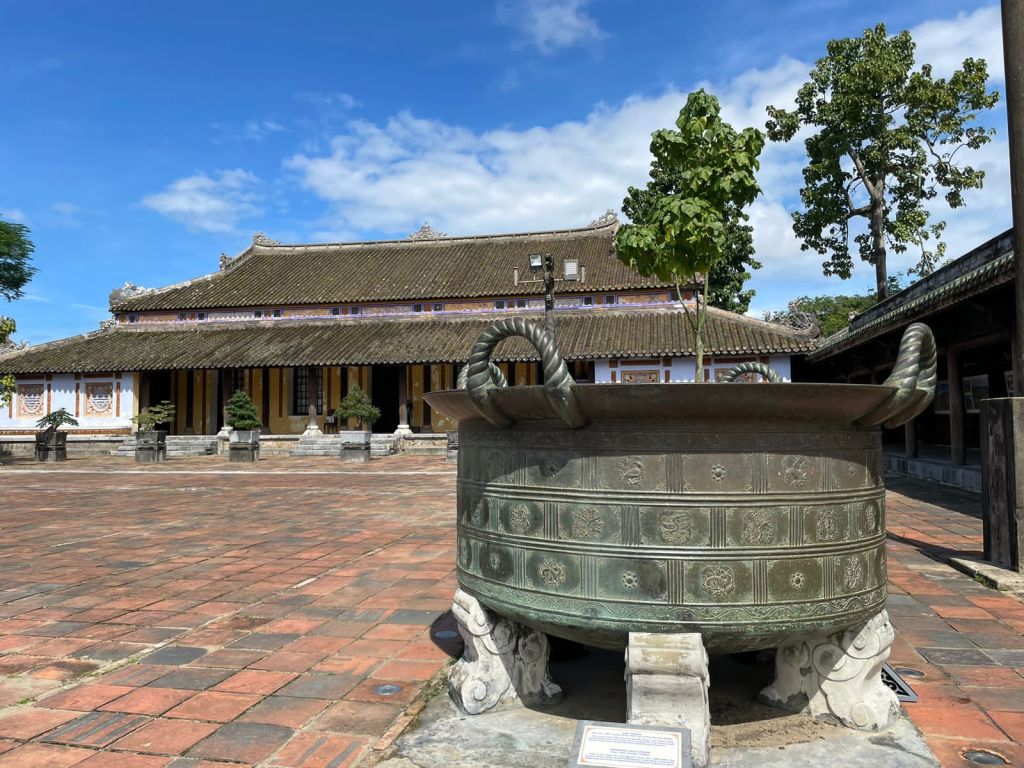 Hue appears to be a sedate yet quirky town, its relatively new past and present jostling together in good contrast. Built in 1803 the citadel and imperial city within it, house the mansions, shrines, and gardens of the Nguyen dynasty. Peppered with green porcelain roofed pagodas, floral tiled floors, and imposing courtyards the imperial city is scenic. Beautifully crafted, massive bronze cauldrons brimming with water reflect the fiery blue sky in the courtyards in a confluence of heaven and earth.