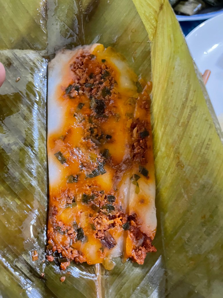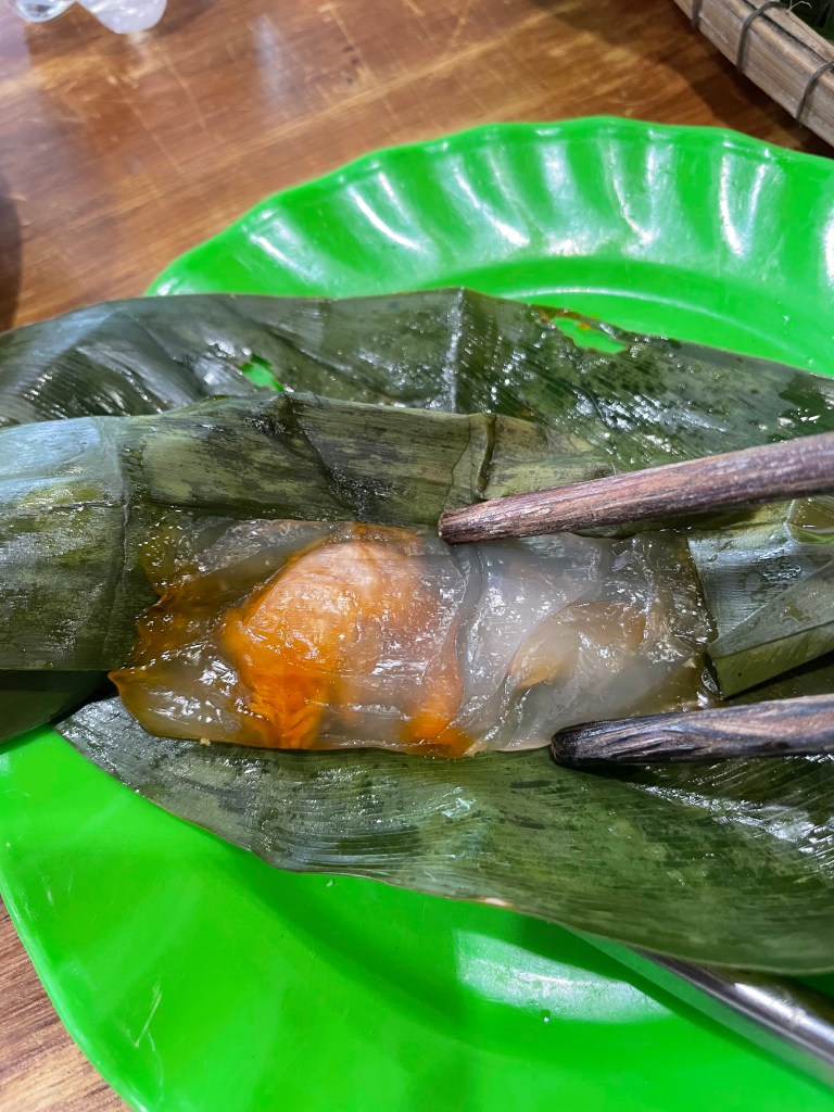 We are ushered into a smaller adjacent room and soon a steaming hot meal is presented in front of us. Banh Nam Hue is a longish rectangle of rice and tapioca flour dough, generously spiked with a mixture of pounded shrimp, pork and onions wrapped in banana leaves and steamed. It is lusciously soft. There are also smaller banana parcels of steamed, clear glass-like rectangles of tapioca dough studded with a full shrimp within. This is Banh Bot Loc, another delicacy of the region.