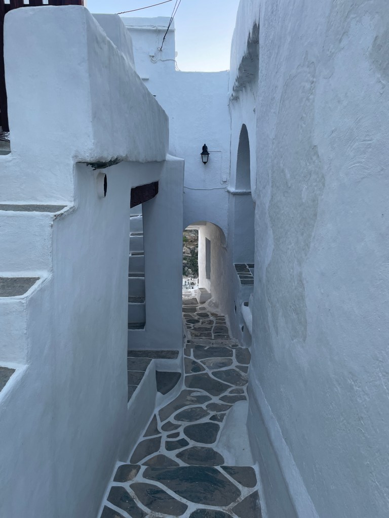 The settlement of Kastro, the old capital of Sifnos is built fortress-style atop a hill overlooking the bay. You enter through narrow arches and the claustrophobic mazelike alleys, now whitewashed and home to chic tavernas, once served as defenses against the barbarians. There are tiny ledges, that run over the narrow cobbled paths. Perhaps, the inhabitants poured hot oil over any unpleasant intruders. Roman pillars are causally incorporated into the homes, and I feel that history runs deep here.