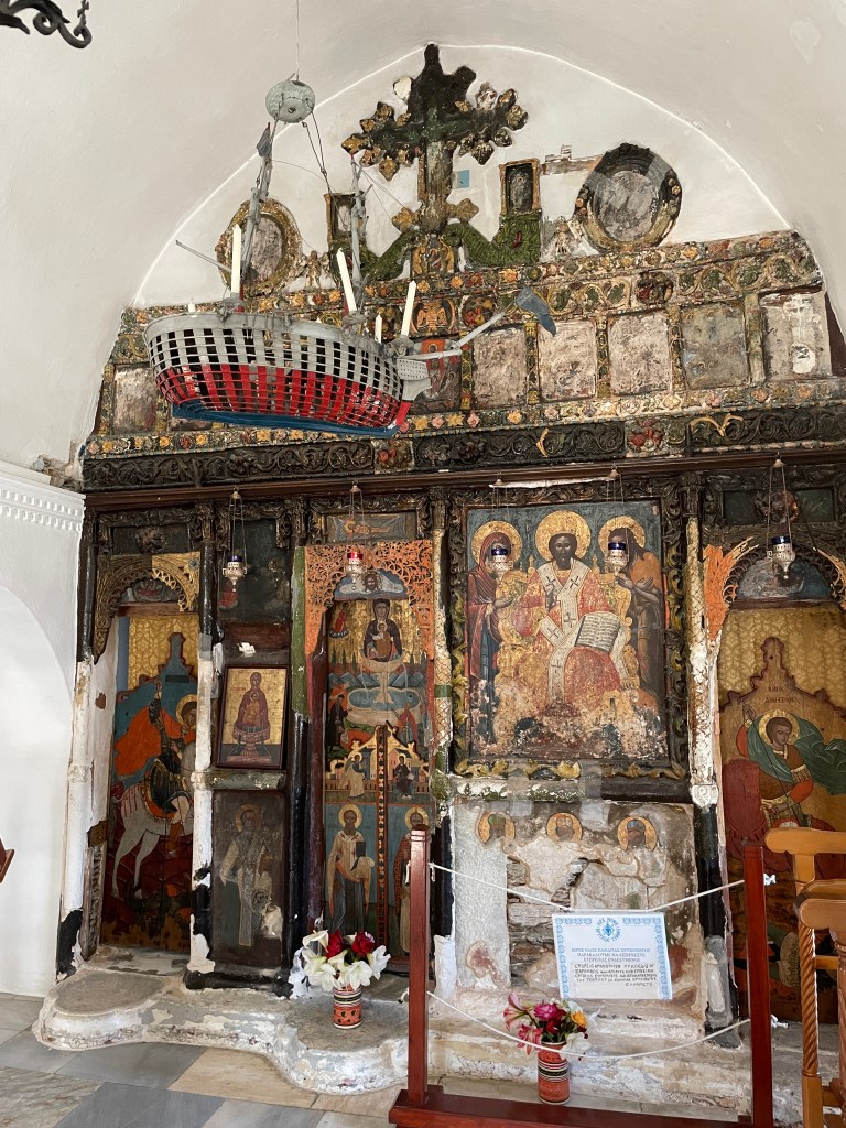 Arjun gets down to polishing a marble stone, we picked up on the trail. A little labour and we have fine marble powder that flies off in the wind. Dhanya, like the ladies of ancient sifnos seeks refuge in the chapel from the wind. Inside there are decidedly medieval-looking paintings on wooden boards. The altar has a hanging metal ship. One hopes, this is for the Christian pirates.