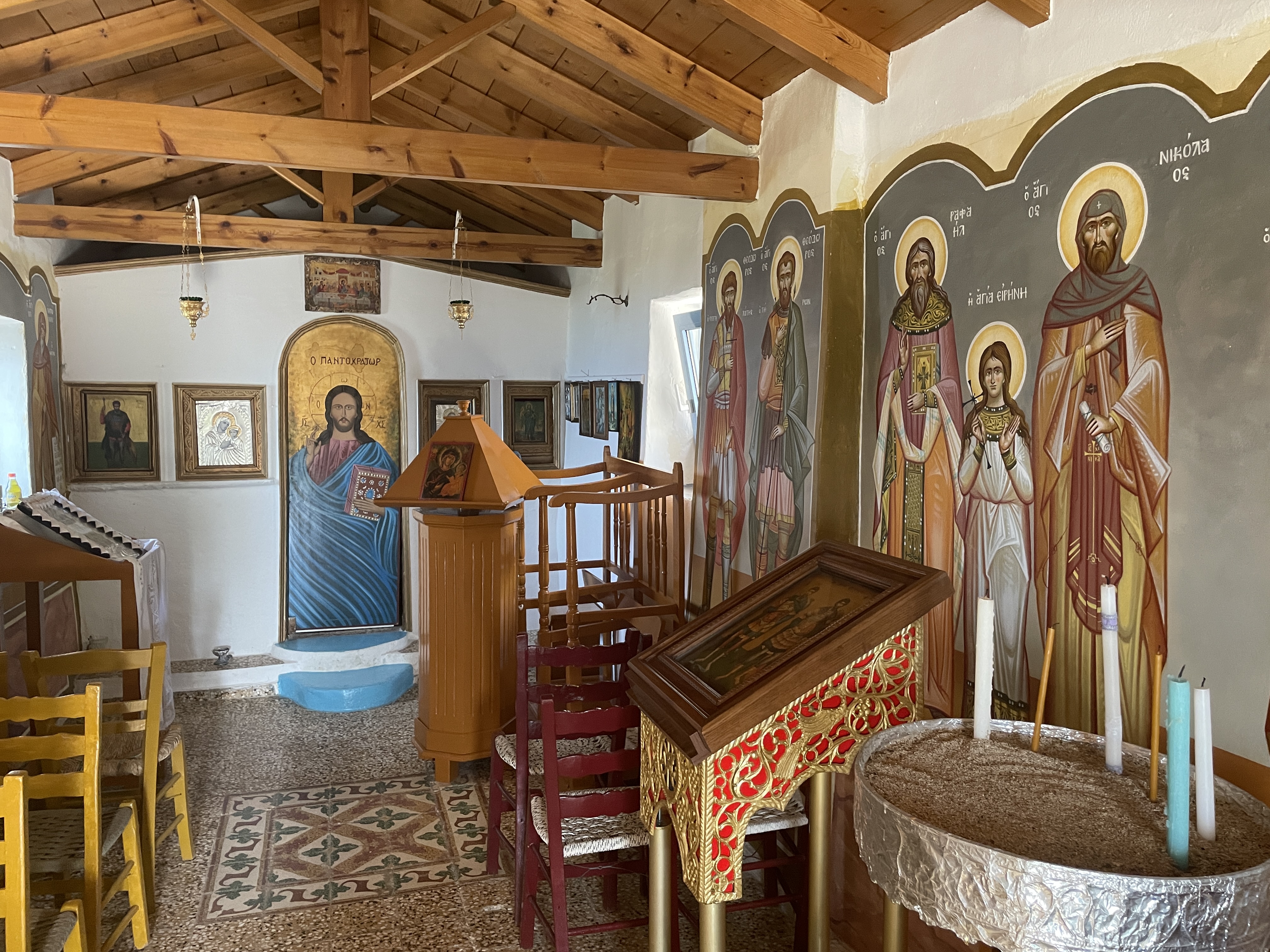 The trail is through low pine trees. There is the requisite number of small Greek orthodox chapels, the benches for the devout neatly empty and provisioned with incense and candles. One of the chapels, claims to be 300 years old. That’s roughly when folks from modern-day Albania, began settling on this island