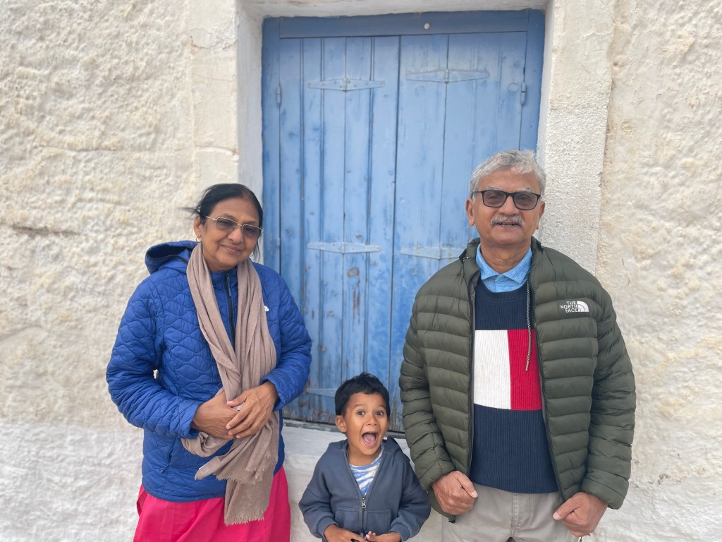 On the clear blue waters of Dragonera, Arjun sips orange juice while we sit in the shade of the green pines that grow right to the edge of the sand.